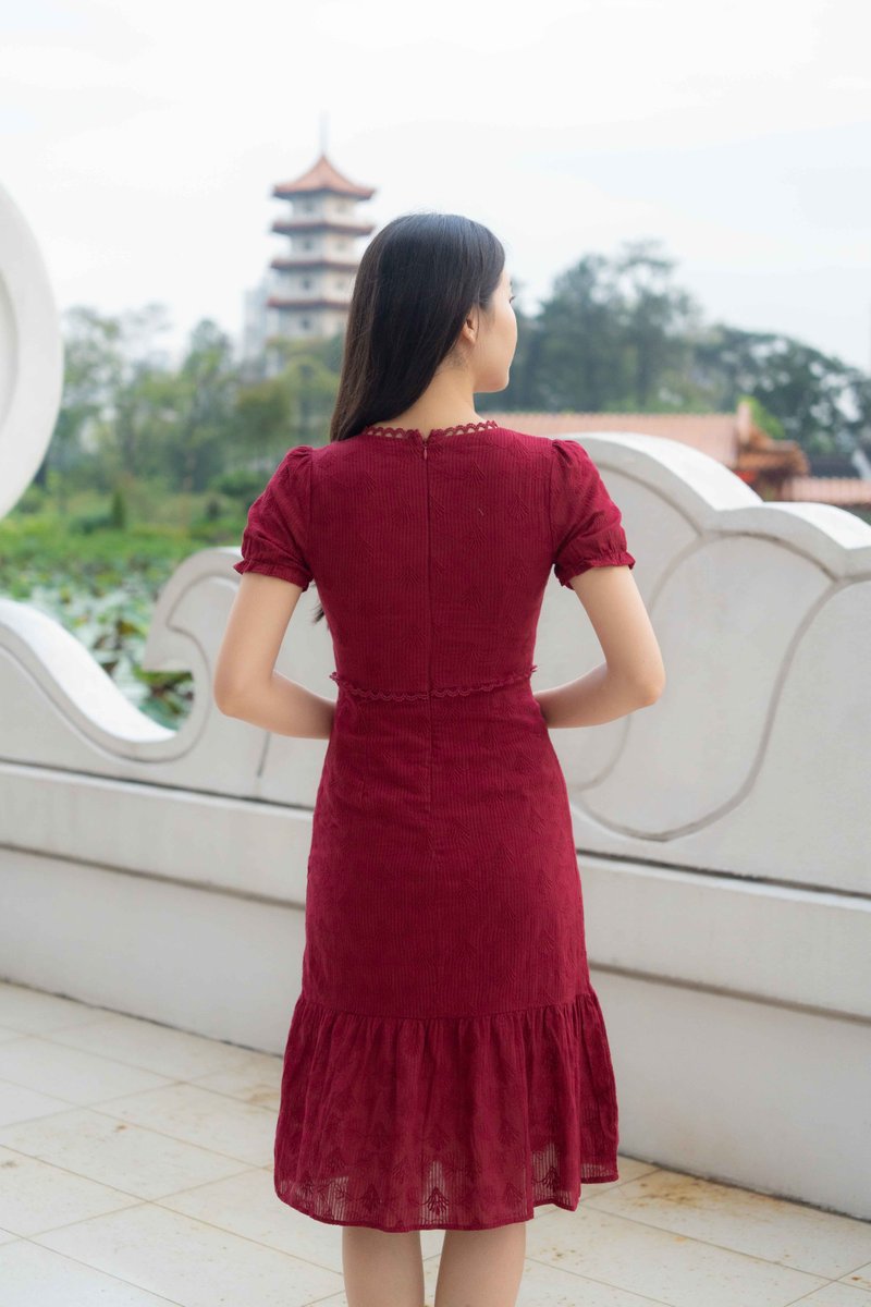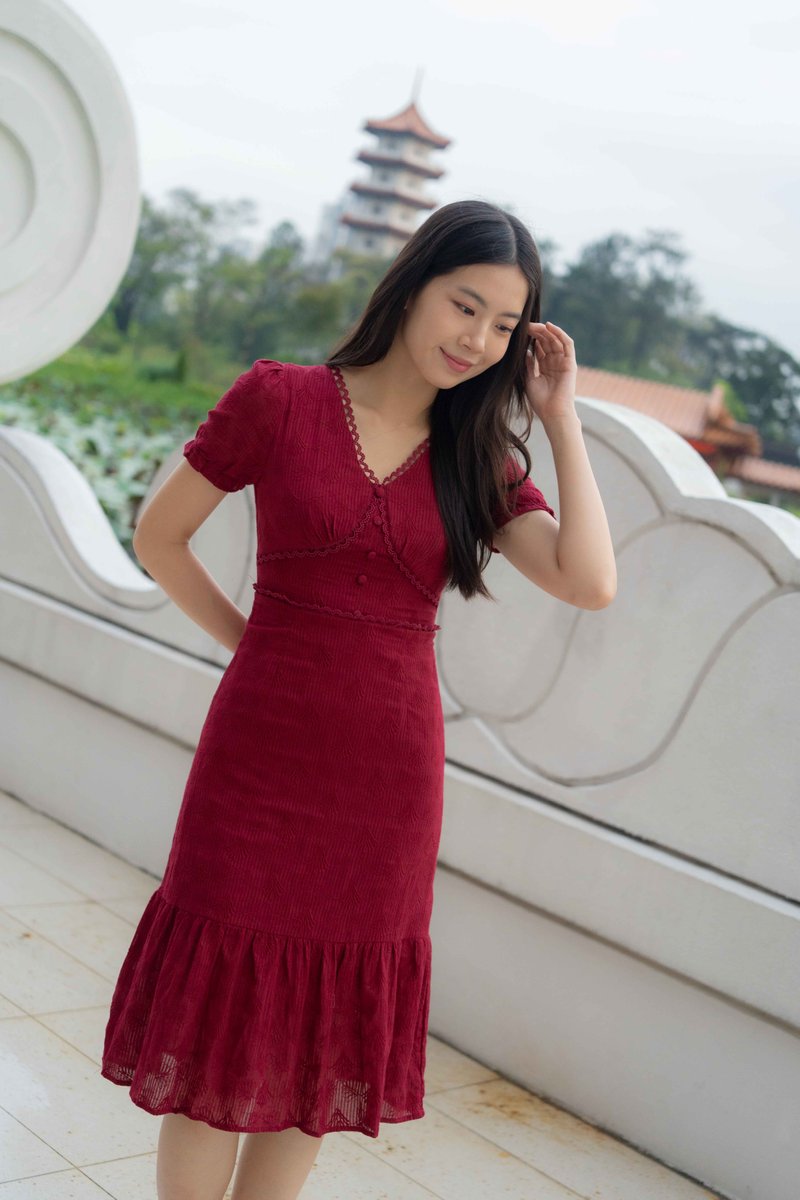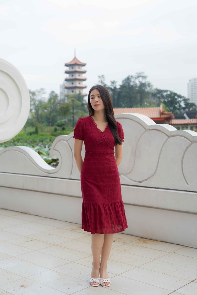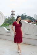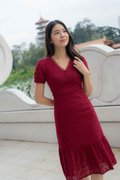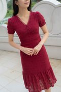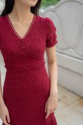 Elise Sleeves V Neck Dress In Wine Red