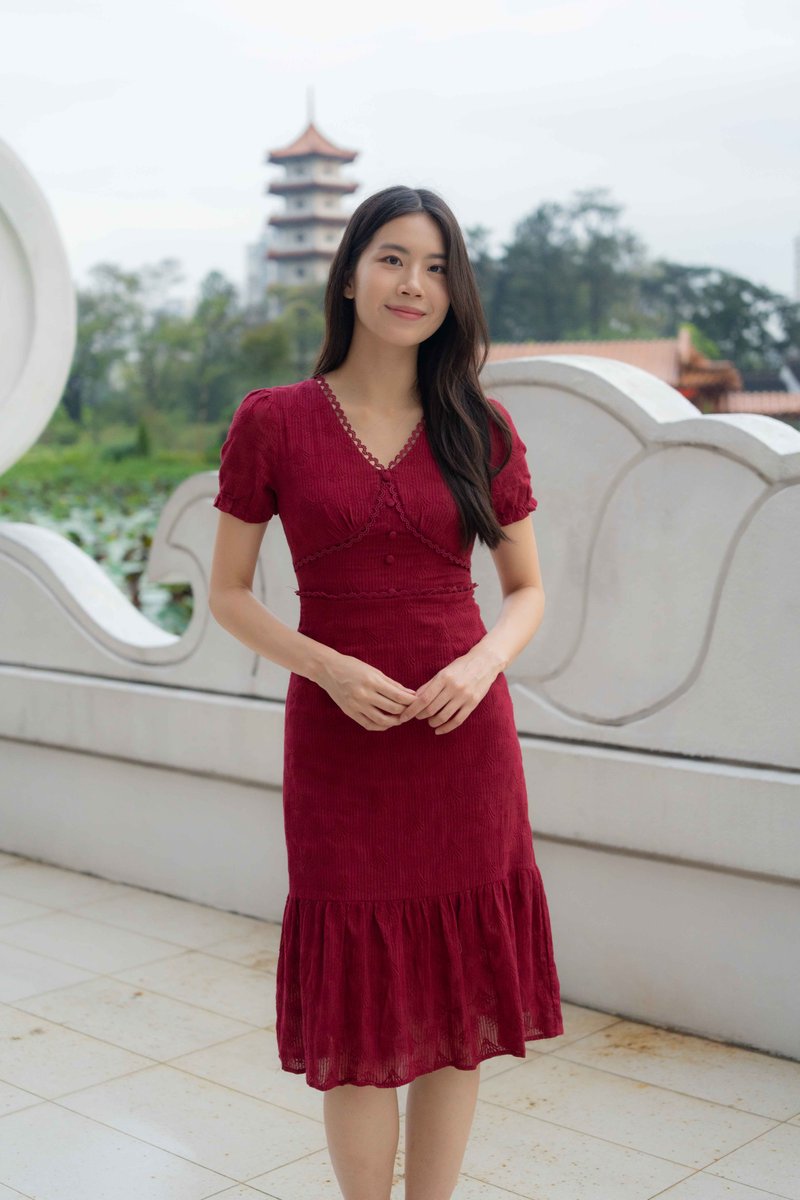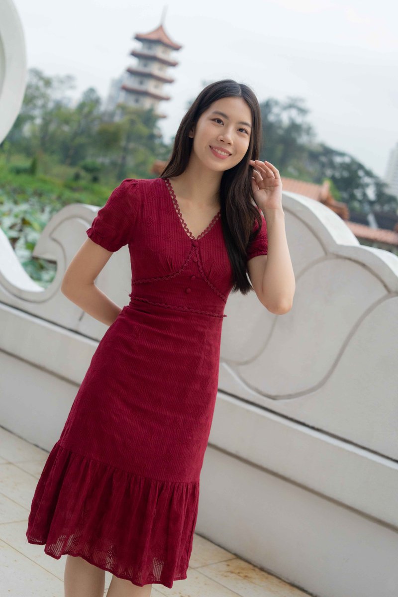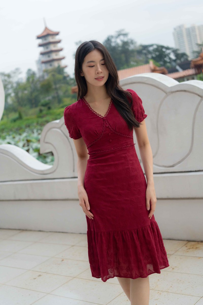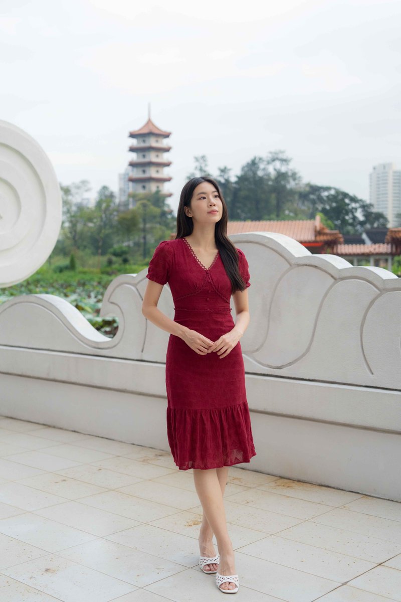 Elise Sleeves V Neck Dress In Wine Red