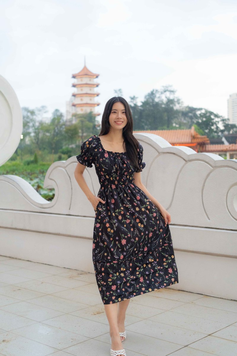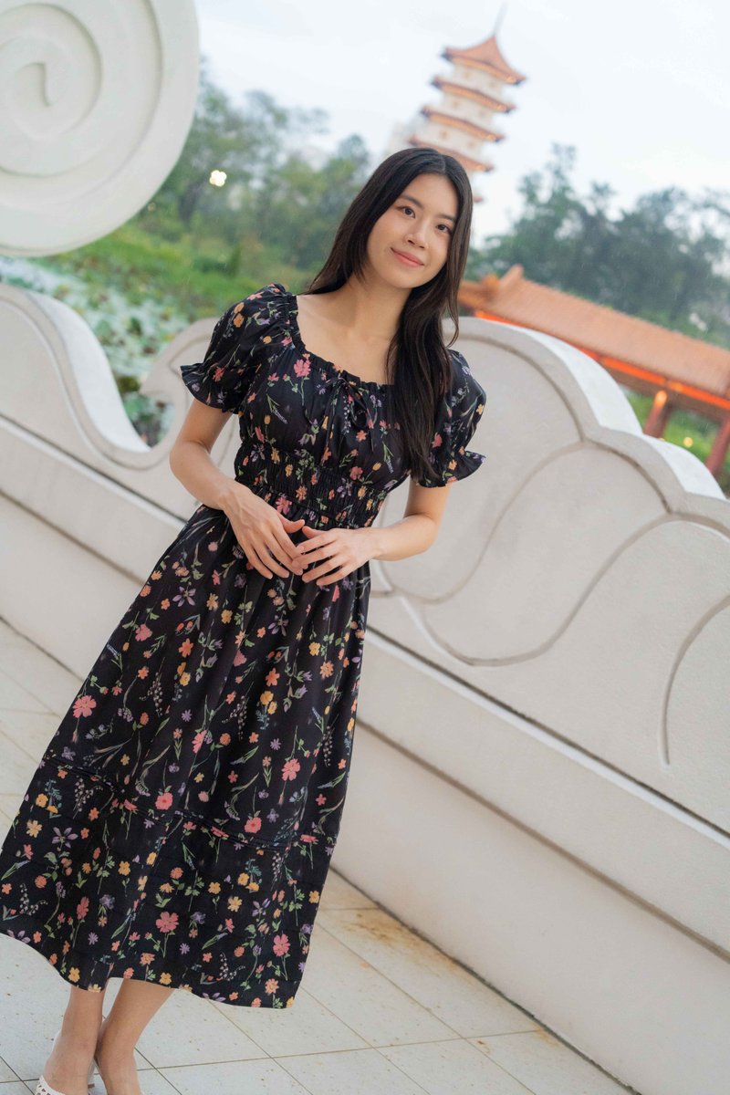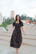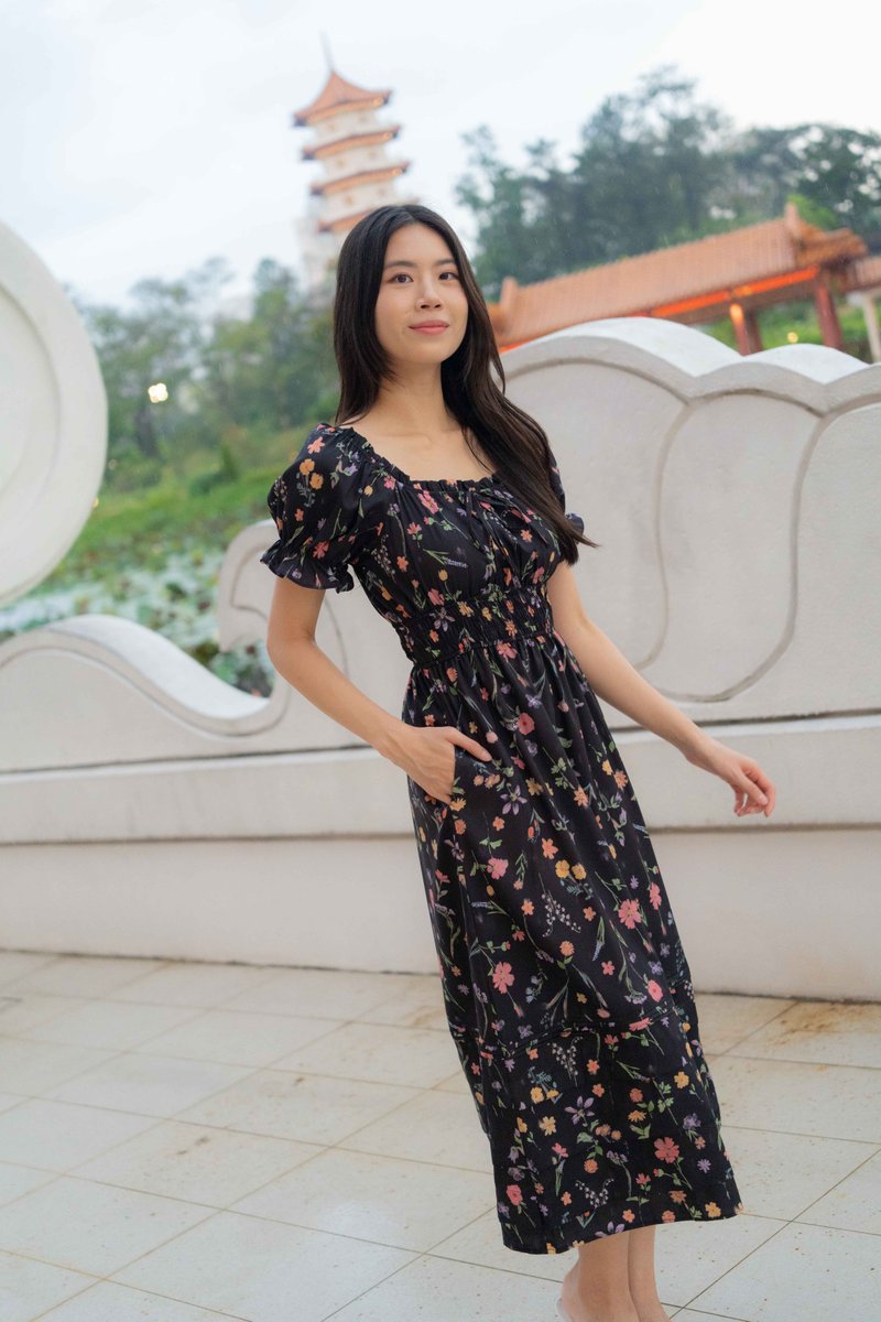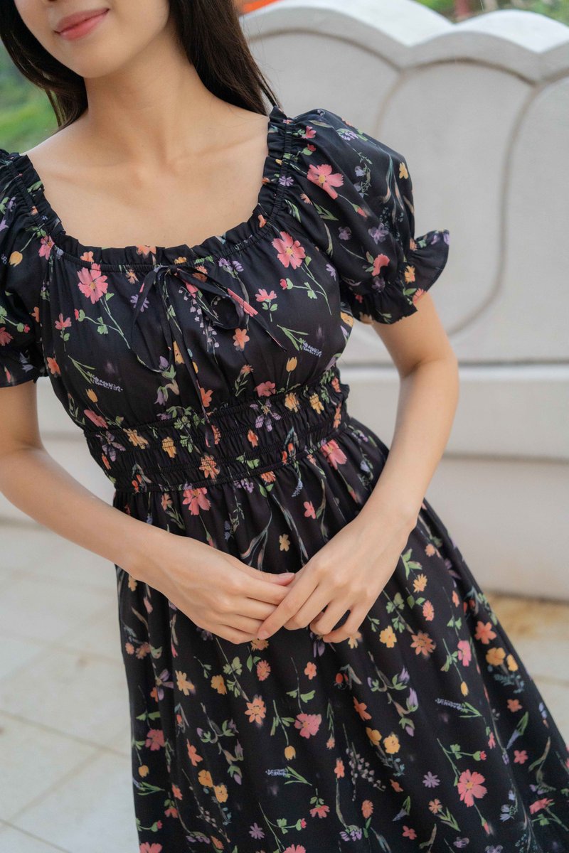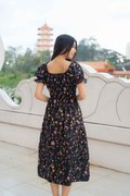 Juliana Frill Sleeves Waist Dress In Black Floral