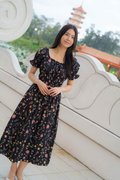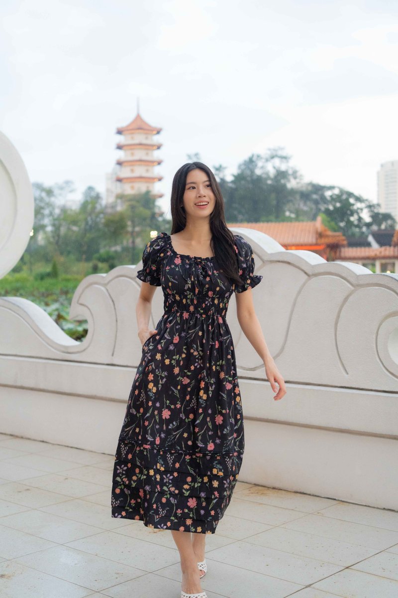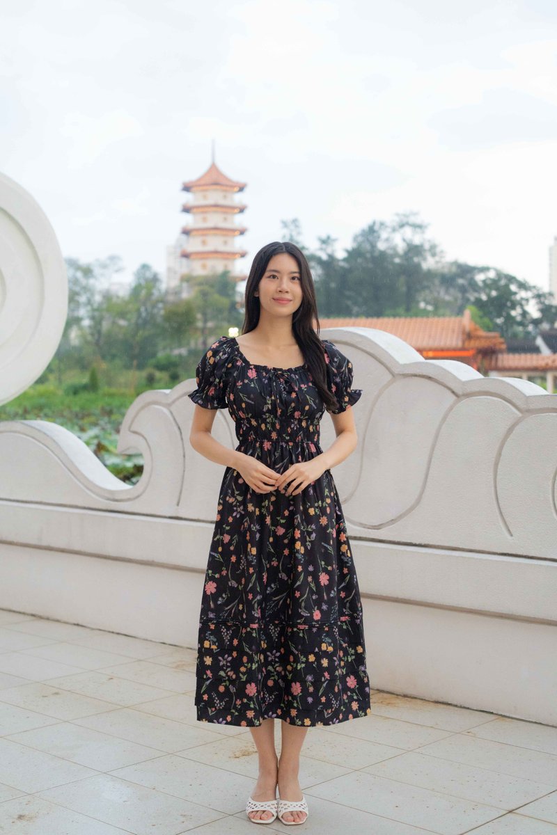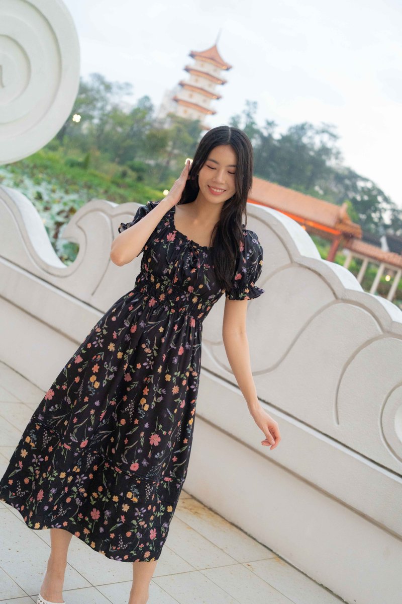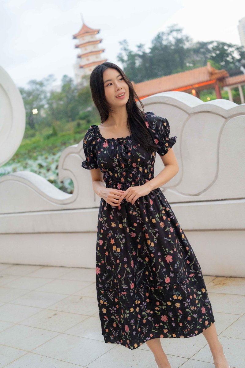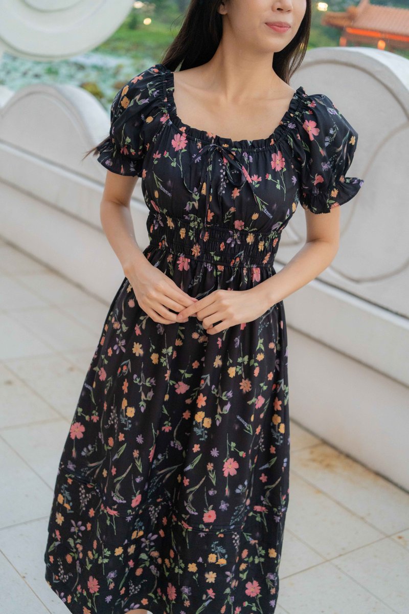 Juliana Frill Sleeves Waist Dress In Black Floral