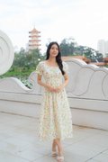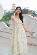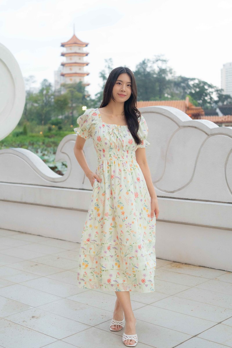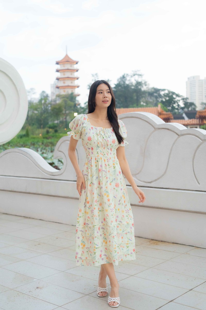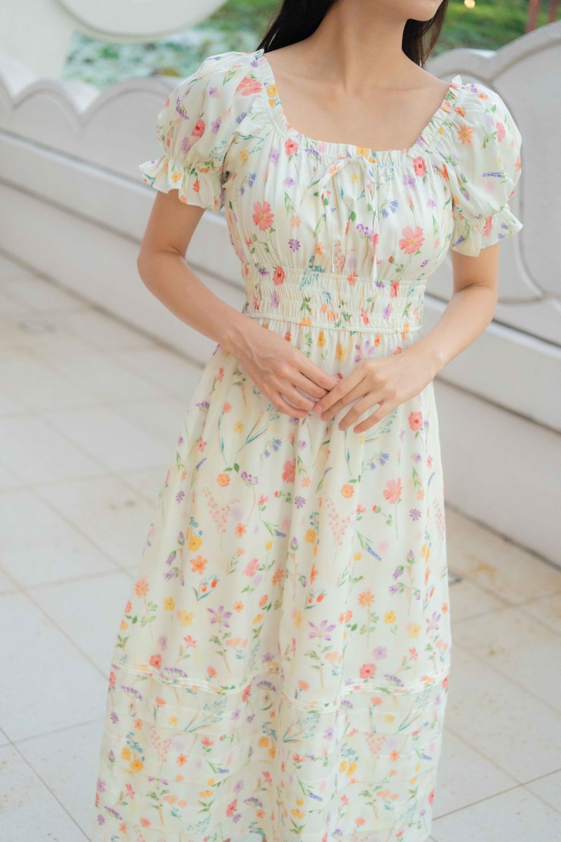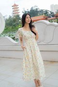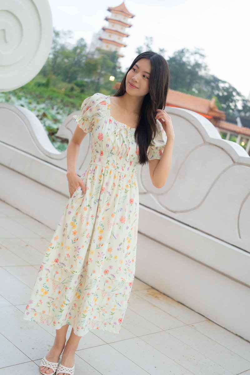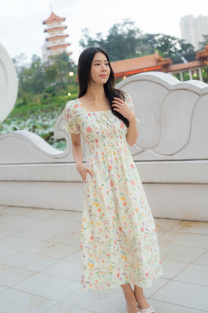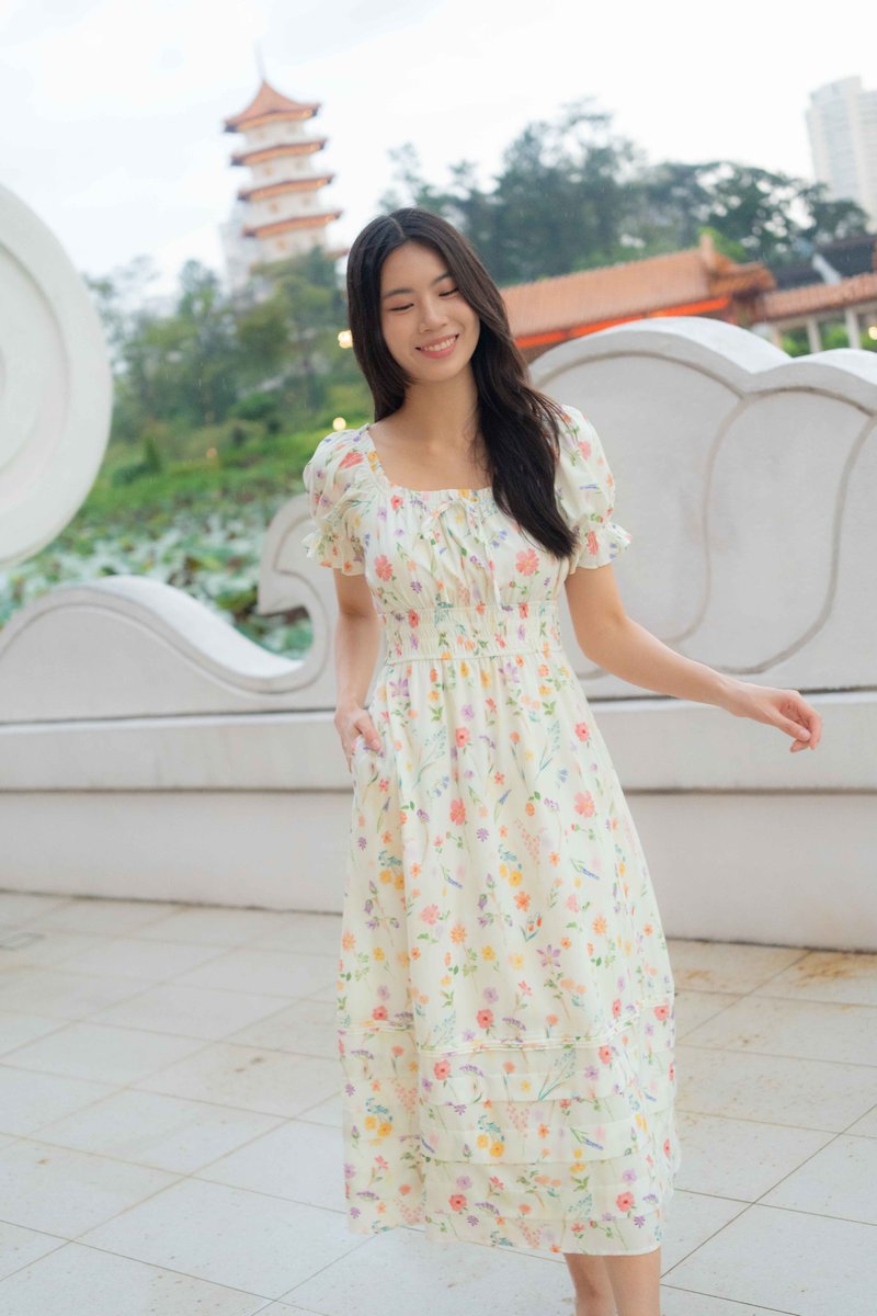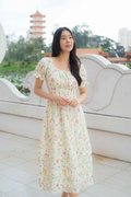 Juliana Frill Sleeves Waist Dress In Cream Floral