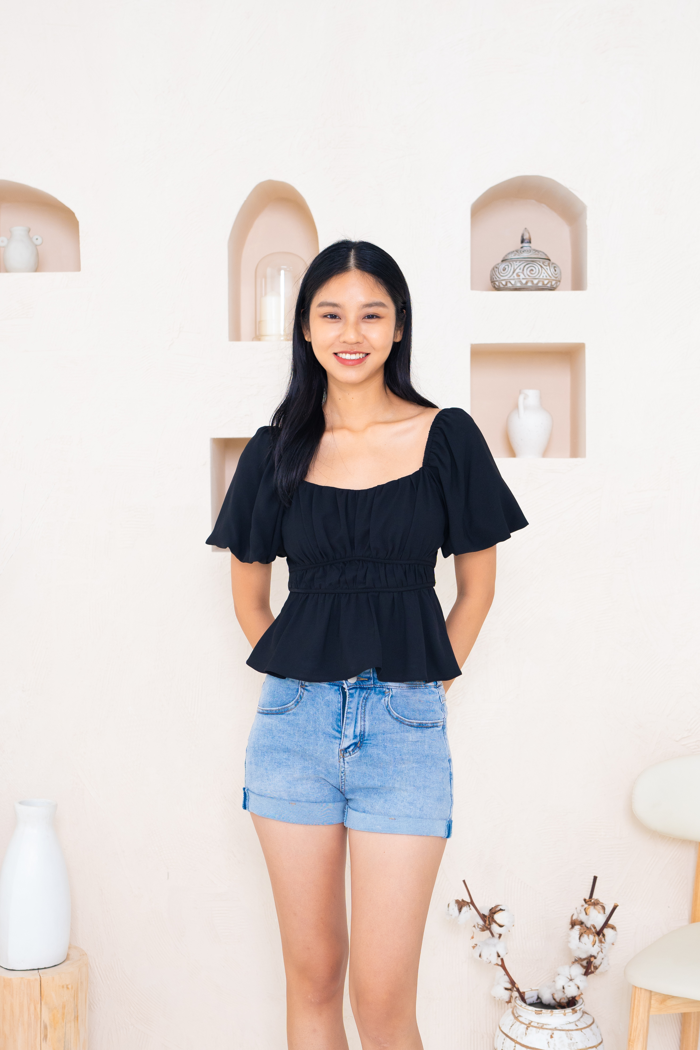 Debby Ruched Peplum Top In Black